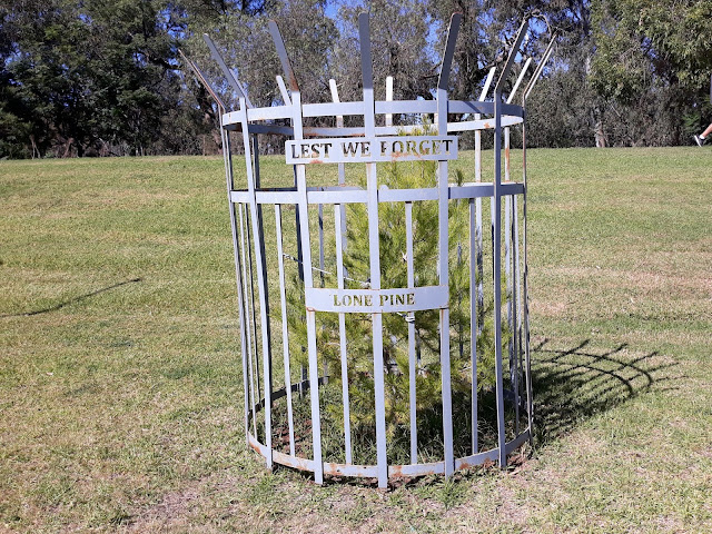 The service was held at the cemetery and though we didn't expect to see many people there, seeing the town is virtually closed, there must have been about 70 or more in attendance. The service was simple and moving, paying tribute to local people who had fought and died in all wars, was well organised and we were invited, along with all attendees, to a sausage sizzle with tea or coffee afterwards though we opted to go back to the camp for our breakfast.